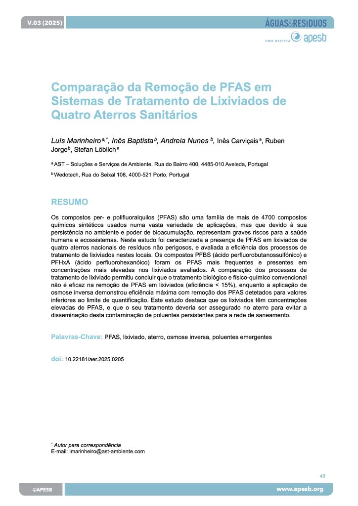 Os PFAS são compostos químicos tóxicos e persistentes. Este estudo quantificou PFAS em lixiviados de aterros nacionais, e comparou a eficiência de remoção destas substâncias em processos de tratamento de lixiviados convencionais e por osmose inversa.