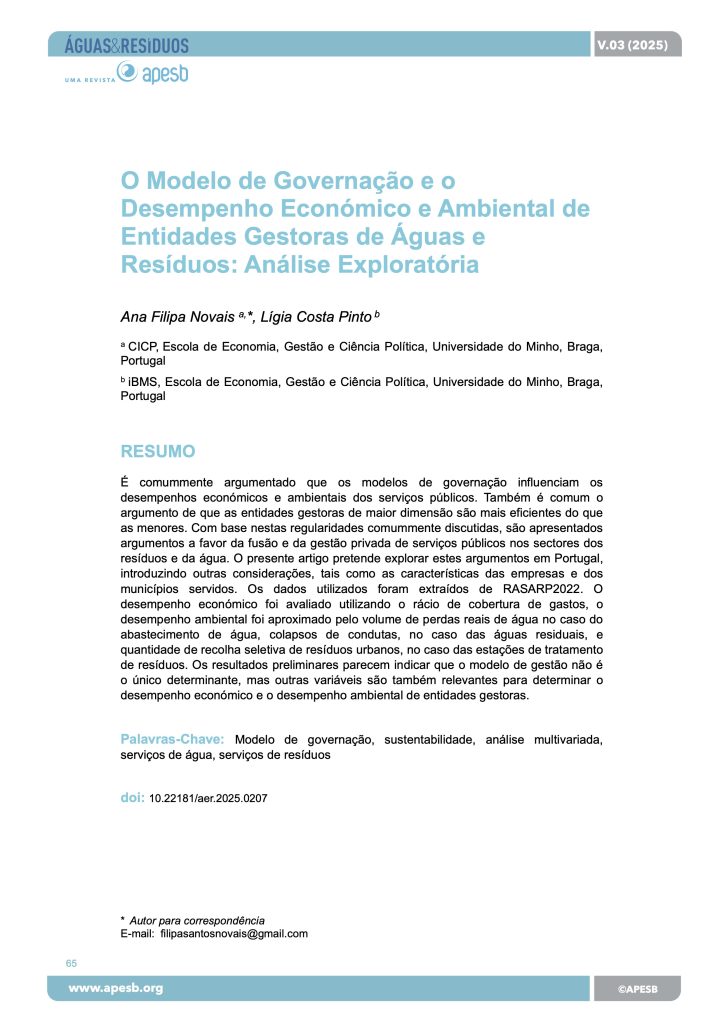 O artigo analisa a relação entre modelos de governação e o desempenho económico e ambiental das entidades gestoras de água e resíduos em Portugal, considerando fatores como dimensão, gestão e características locais. Os resultados indicam que o modelo de gestão não é o único fator determinante, e que outras variáveis são importantes nesta análise.