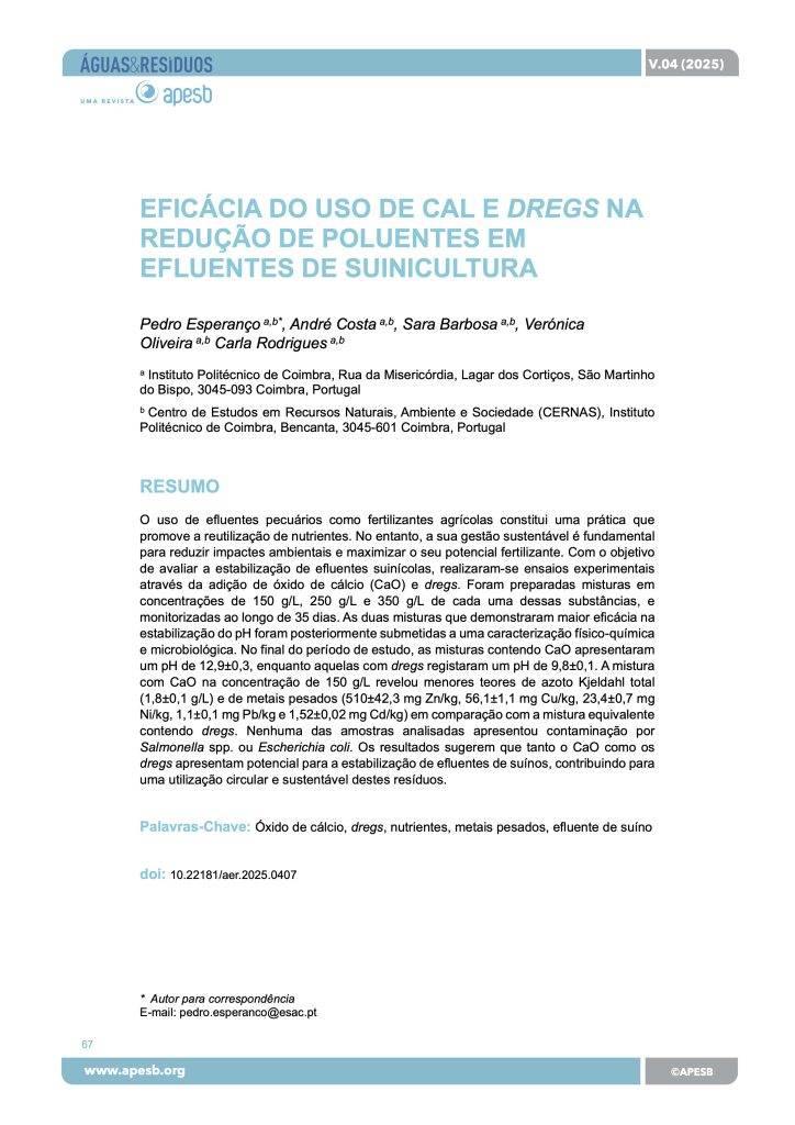 O uso de efluentes pecuários como fertilizantes agrícolas constitui uma prática que promove a reutilização de nutrientes. No entanto, a sua gestão sustentável é fundamental para reduzir impactes ambientais e maximizar o seu potencial fertilizante. Com o objetivo de avaliar a estabilização de efluentes suinícolas, realizaram-se ensaios experimentais através da adição de óxido de cálcio (CaO) e dregs. Foram preparadas misturas em concentrações de 150 g/L, 250 g/L e 350 g/L de cada uma dessas substâncias, e monitorizadas ao longo de 35 dias. As duas misturas que demonstraram maior eficácia na estabilização do pH foram posteriormente submetidas a uma caracterização físico-química e microbiológica. No final do período de estudo, as misturas contendo CaO apresentaram um pH de 12,9±0,3, enquanto aquelas com dregs registaram um pH de 9,8±0,1. A mistura com CaO na concentração de 150 g/L revelou menores teores de azoto Kjeldahl total (1,8±0,1 g/L) e de metais pesados (510±42,3 mg Zn/kg, 56,1±1,1 mg Cu/kg, 23,4±0,7 mg Ni/kg, 1,1±0,1 mg Pb/kg e 1,52±0,02 mg Cd/kg) em comparação com a mistura equivalente contendo dregs. Nenhuma das amostras analisadas apresentou contaminação por Salmonella spp. ou Escherichia coli. Os resultados sugerem que tanto o CaO como os dregs apresentam potencial para a estabilização de efluentes de suínos, contribuindo para uma utilização circular e sustentável destes resíduos.